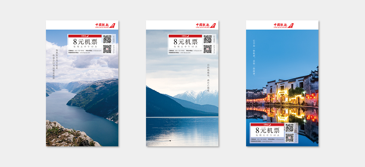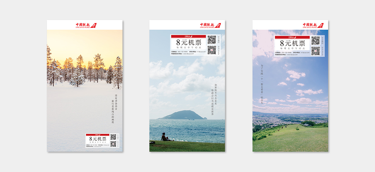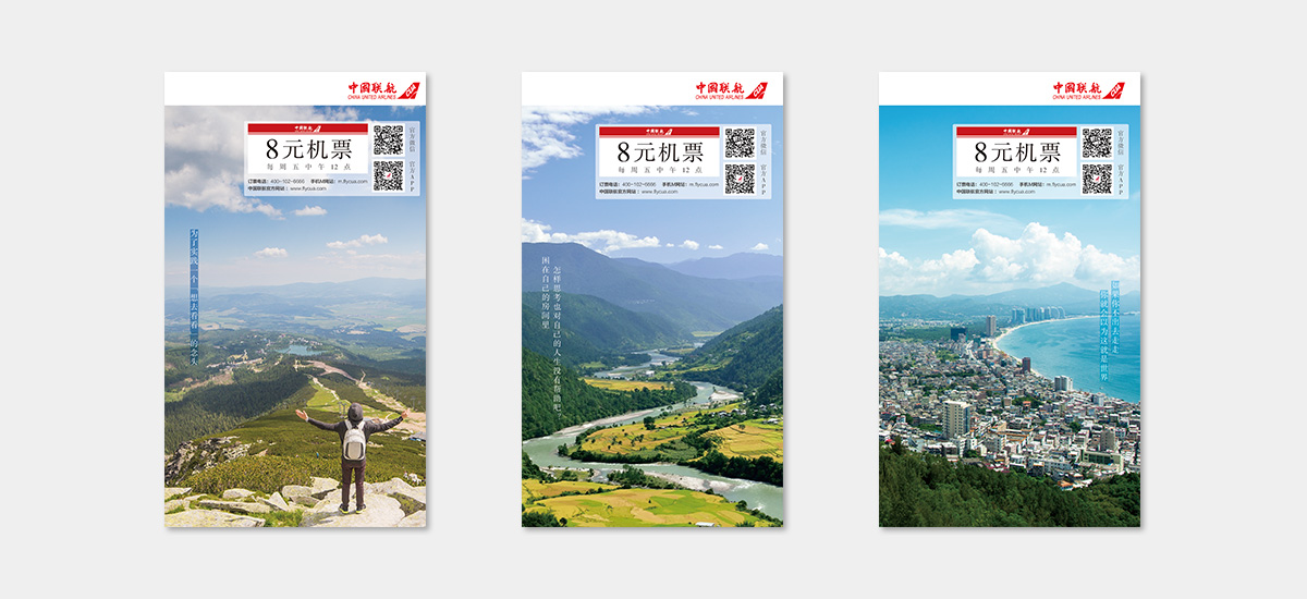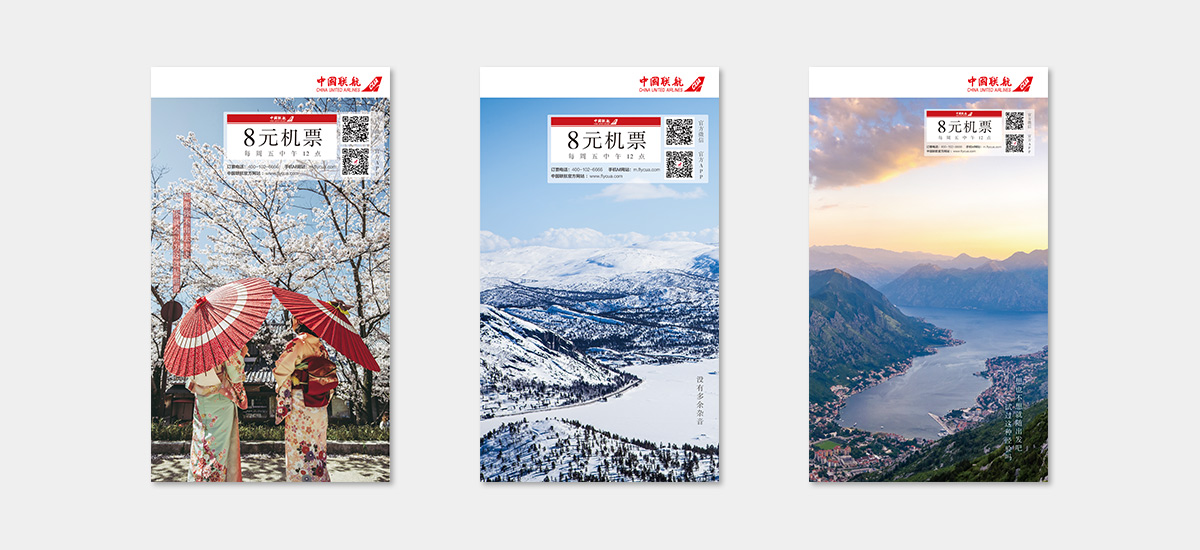 啟止視覺(jué)為中國(guó)聯(lián)合的“8元機(jī)票”活動(dòng)設(shè)計(jì)系列海報(bào)。